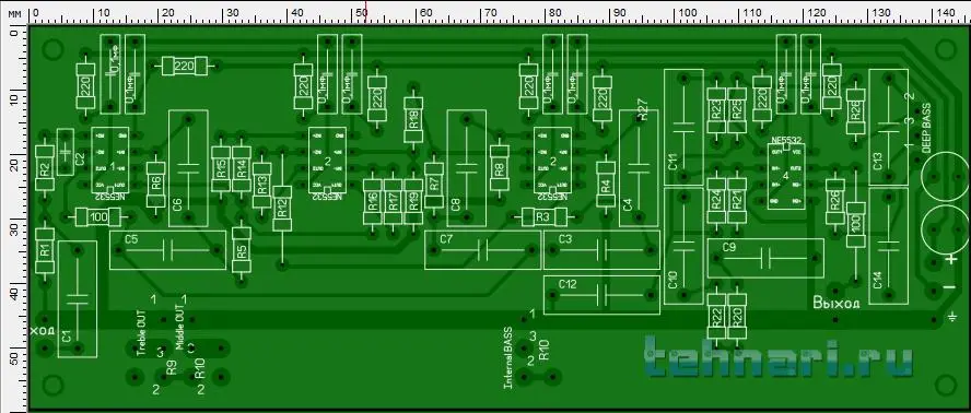 На схеме у автора есть несколько неточностей: так резистор регулировки DEEP BASS обозначен как R2, я его обозначил как R27, и резистор с выхода 7 микросхемы U4B обозначен как снова R26,я его обозначил как R28.