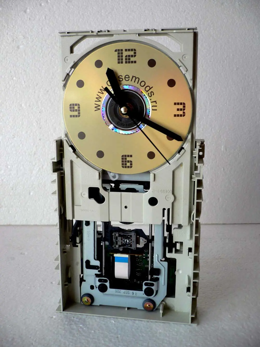 Эти часы (предвидя замечания, скажу: да, ещё одни часы! :D) были сделаны буквально за пятнадцать минут из горелого CD-ROMa. Циферблат сделан из CD-диска, а цифры на нём нанесены по технологии LightScribe и потом сам диск приклеен клеем POXIPOL к каретке, сзади тем же клеем приклеен механизм. Всё! Моддинг-часы готовы! :)