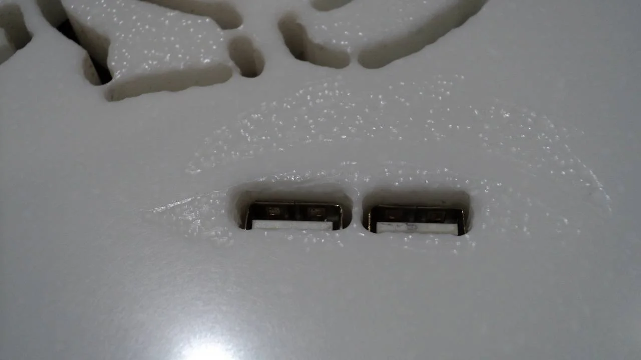 Вырезал отверстия под юсб. Больше двух, наверное, не надо. Из того, что было на работе с подобным разъёмом только модем, не думаю, что может быть что-то покороче.