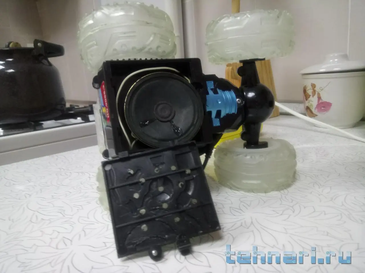2. В машинке нашел обрыв провода питания, заменил старый аккумулятор на 700 мА, другим 3200ма, поместил все в корпус. Вывел провод антенны наружу (теперь ловит дальше). Заменил динамик, вышедший из строя на СССР:fase: