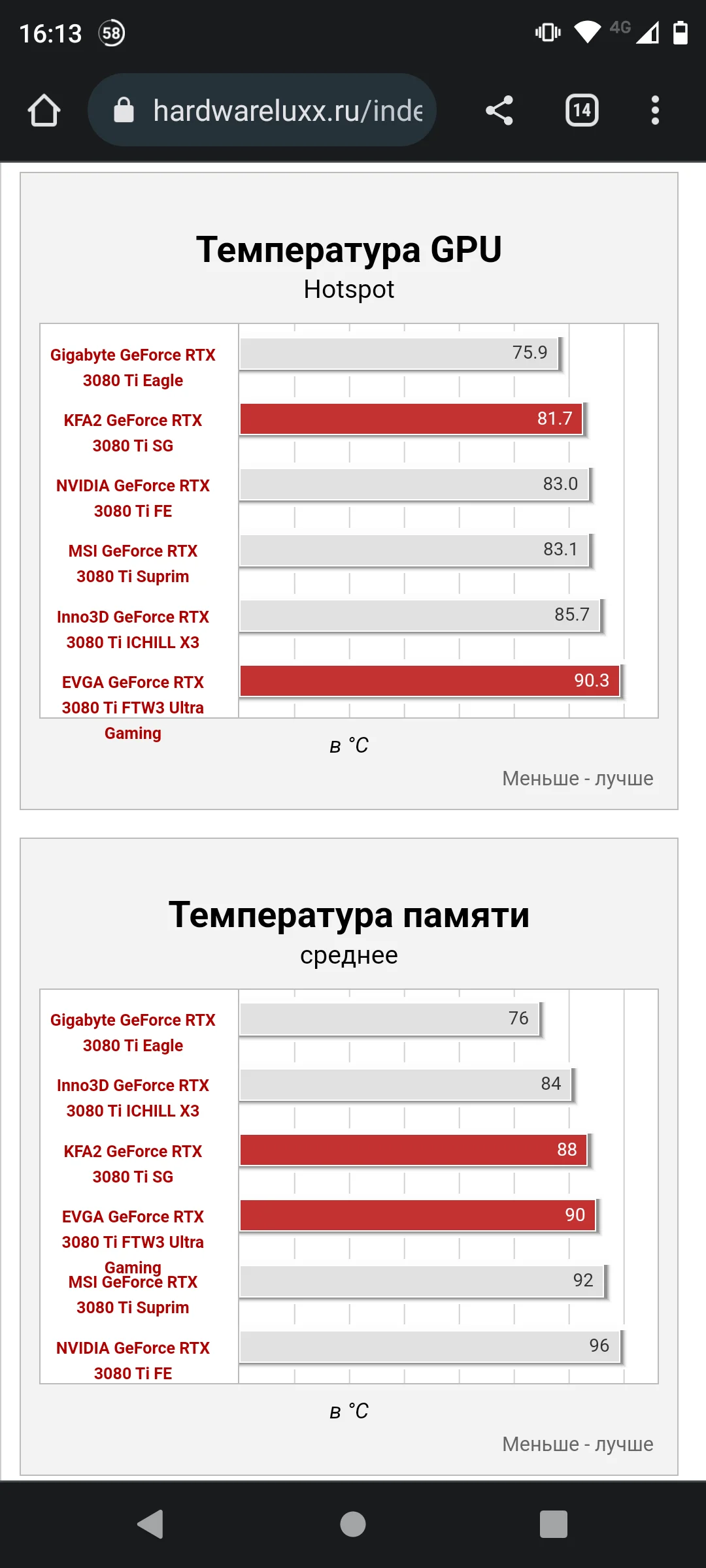 Если у твоей KFA2 GeForce RTX 3080Ti SG по чипу температуры в норме,то хот спот(не уверен,он вроде на Nvidia вообще не работает) и память горячеватые. А это горячие GDDR6X,так что смотри аккуратнее. В ДНС на уценке прям пачками лежали 30хх карты,у которых были отключены по 1чипу памяти. Ты выше приводил Vik-она,можешь у него узнать в чем там причина.