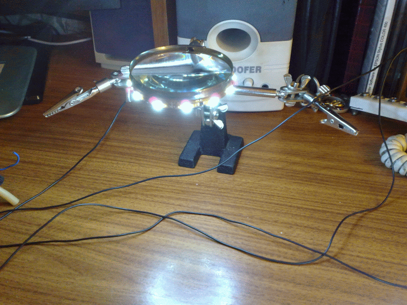 Началось всё с "третьей руки" с лупой (где-то я её уже показывал). Иной раз и так не знаешь, как лучше деталь под лупой разместить, а тут ещё думать приходится, чтобы руки свет не загораживали. Поматерился пару раз, пошёл в магазин, купил кусочек ленты, обклеил лупу по кругу и - вот оно, счастье!