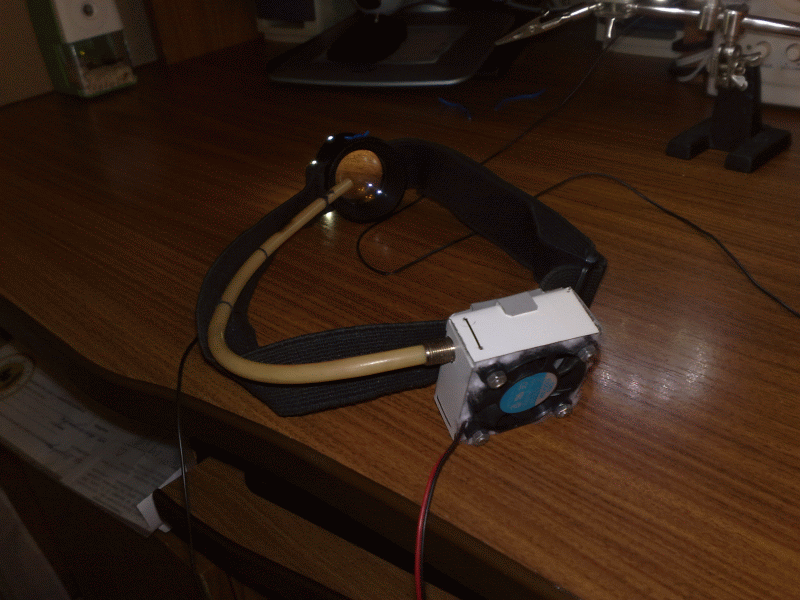 Коробочку с вентилятором я решил подвесить на ремешок на затылке, от штуцера идёт трубка к линзе. Трубка пришита к ремешку несколькими свободными (чтобы не ограничивать эластичность ремешка) петлями.