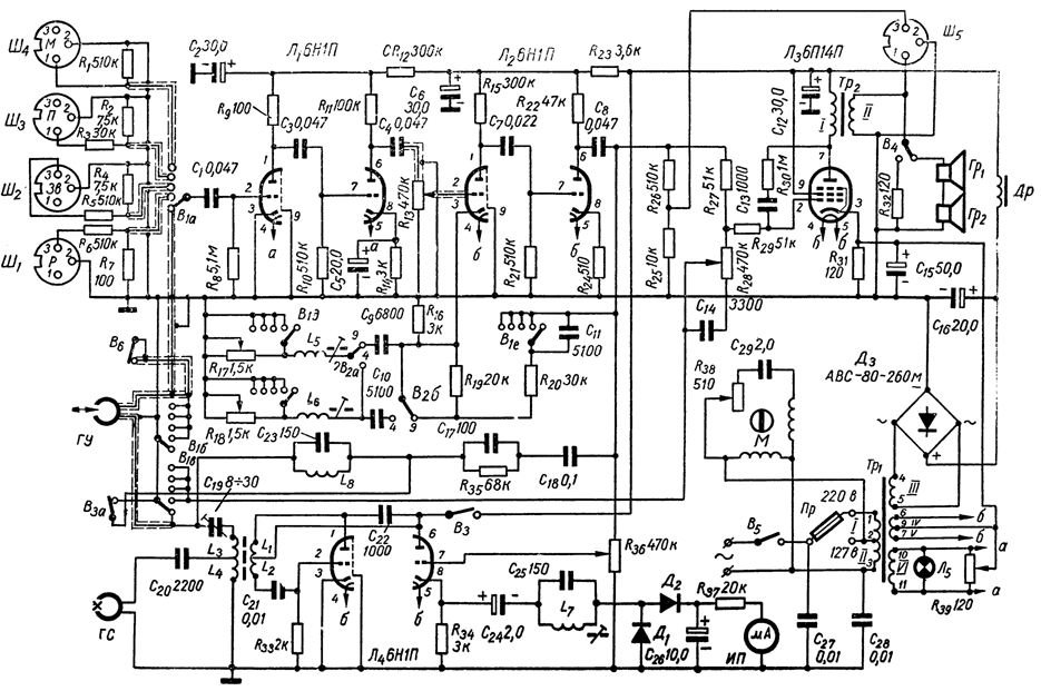 Усилитель только верхняя часть схемы, внизу 6Н1П - генератор стирания и подмагничивания ... :)