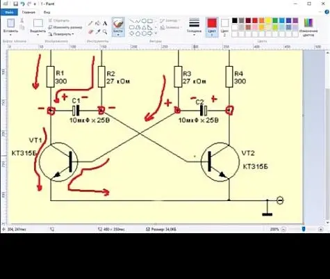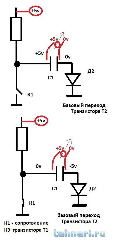 Обьясните на пальцах форумчане, почему при разряде С1 потенциал в узле между R2 и С1 отрицательный?