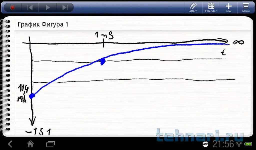 А мы его и не искали. Это было сделано чисто графическим путём. Я же написал физический смыл постоянной времени RC-цепи - это время, за которое конденсатор зарядится в е раз. Иными словами, ток заряда упадёт примерно в три раза. Далее я разделил начальный ток I5.1 примерно на три равные части (ведь е = 2,7 а это примерно 3) и отметил точку на графике. Далее через все известные точки провёл экспоненту.