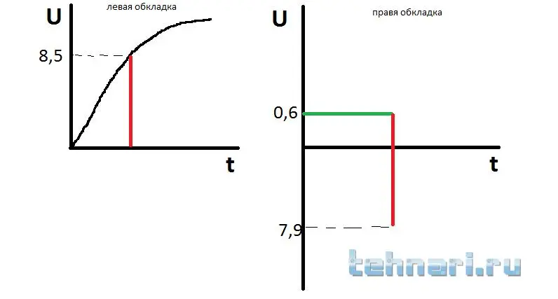 Итак, мы выяснили, что заряд конденсатора приблизился по напряжению к 8,5 В на левой обкладке, что соответствует времени тау. Теперь ключ S1 замкнут (чуть чуть не доходя тау)