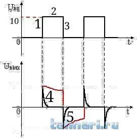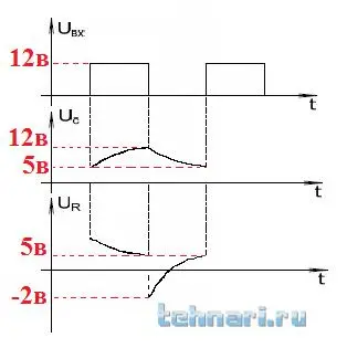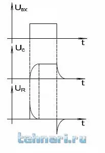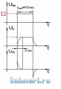Что значит "конденсатор заряжен"? Напряжение на конденсаторе НЕ МОЖЕТ мгновенно измениться (как и, к слову, ток через катушку индуктивности). При подаче импульса в первые микросекунды напряжение на конденсаторе остается нулевым, поэтому вся амплитуда садится на резистор. Потом конденсатор начинает заряжаться, напряжение на нём растёт, а, соответственно, на резисторе — падает. В конце концов конденсатор заряжается до амплитуды, и тогда на резисторе остается 0. Что мы и видим.