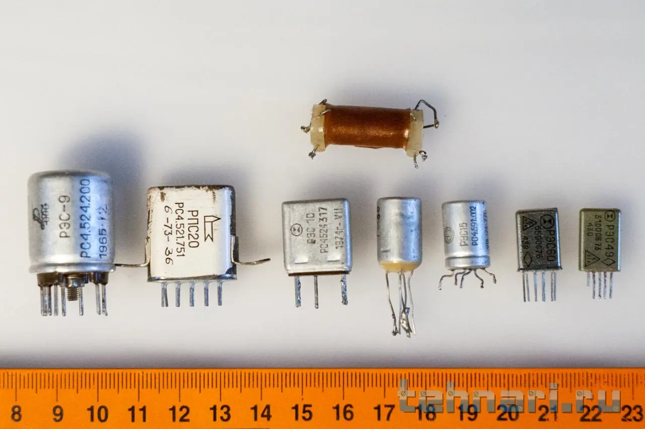 3. Реле разные, слева на право: РЭС-9, РПС20, РЭС 10, РЭС-15, РЭС15, РЭС60, РЭС49. Элемент сверху идентифицировать не удалось, похож на реле, маркировок нет.