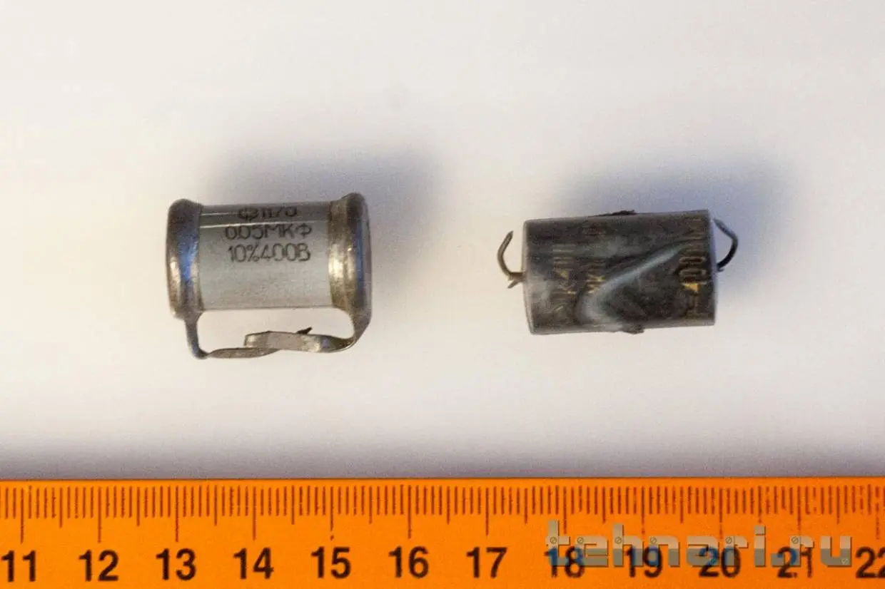 5. Конденсаторы. Первый, предположительно, серии КБГ-И (Конденсатор бумажный герметичный), номинал 0.05 мкФ 400 В. Второй - бумажный К40П-1, 47мкф, судя по всему редкий.
