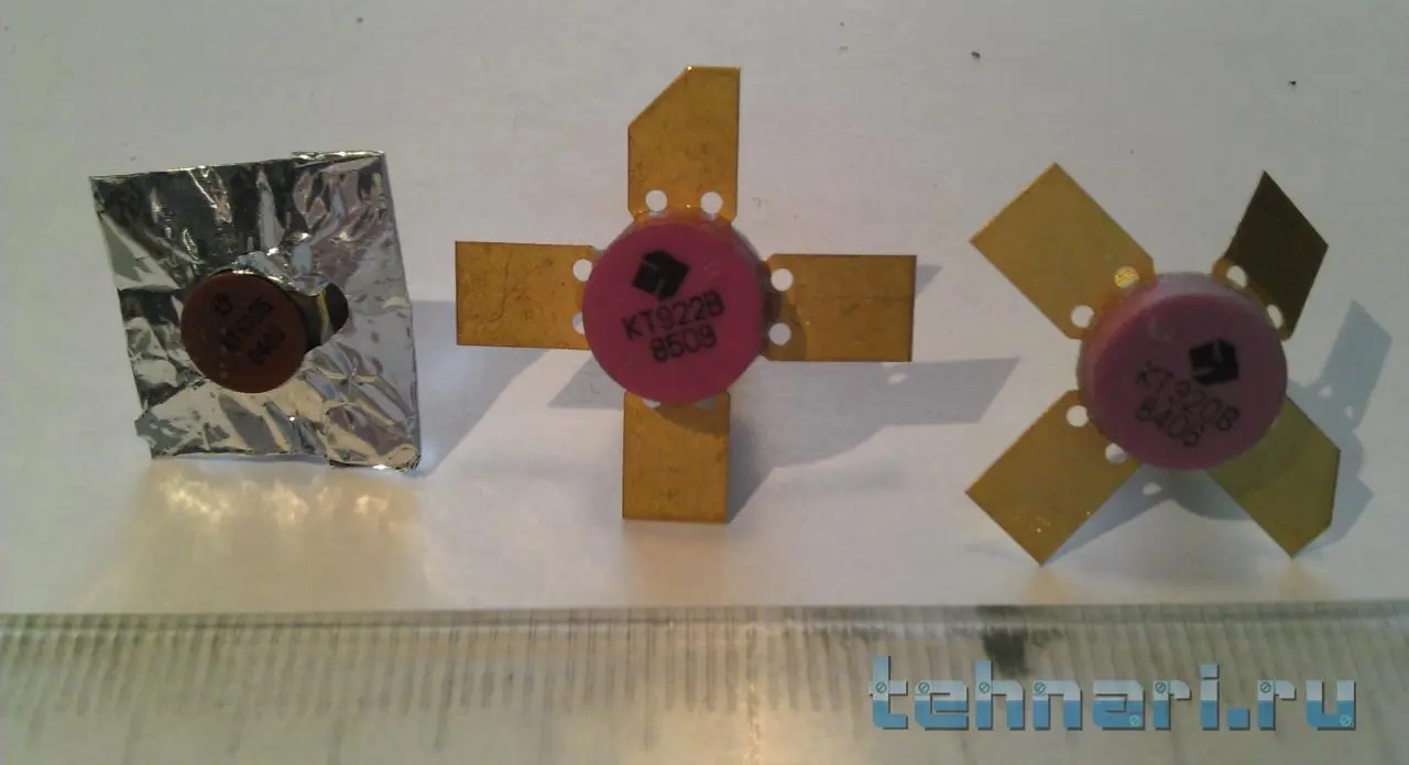 Если плохо видно, перечислю слева направо: 1Т341А, 1Т329Б, КТ342Б (в центре для оценки размеров) 2Т372А. Сверну ВЧ-модуль, выполненный на поликорундовой подложке. Транзисторы немаркёр.