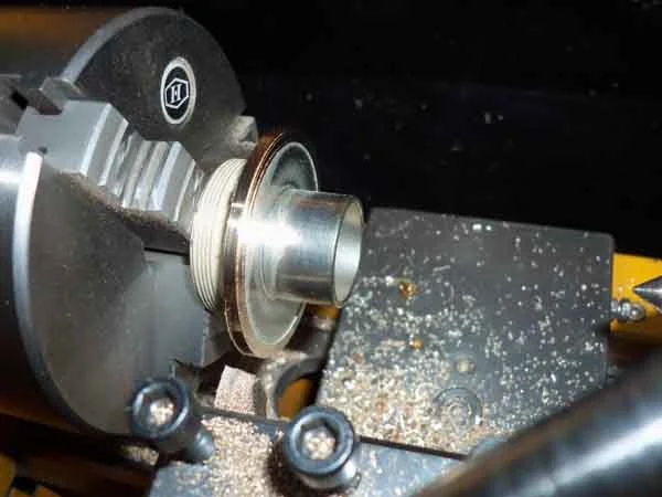 Изобретал горловину. Нашел подходящую заготовку, труба с резьбой из нержавеющей стали (внутренний диаметр 41мм) и накидная гайка. Обточил это хозяйство, сделал накатку на гайке. Деталь на заднем плане из закромов, материал латунь. После обработки на токарном латунной вставки, собираю узел в целом. Внутреннее отверстие в латунной детали - под вышибной клапан, на случай аварийных ситуаций. С клапаном скорее всего совмещу и щтуцер для вывода бензовоздушной смеси.