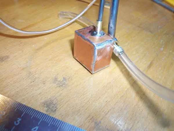 Ух, как здорово я провел это время. А напало на меня нечто простудное, подлое и коварное до не могу. От я и "не мог" все эти дни, да так качественно, что хоть какой то интерес к жизни начал появляться только сегодня. Посмотрел на календарь - времени осталось всего ничего, хотя и работы уже почти все сделаны. Сегодня взялся за поплавок. Памятуя про первый, "подводный" вариант, даже провел кое какие расчеты. Решил, что 6 кубиков объема мне хватит. Поплавок спаян из тонкой медной фольги, размеры 1.5х2х2см, внутри латунная трубочка от телескопической антенны, на которую закреплен магнит от пищалки с какого то принтера. После сборки получилось, что магнит находится внутри поплавка, меньше мусора собирать будет. Направляющей служит латунная трубка с герконом внутри, по ней поплавок и будет перемещаться, отслеживая уровень. Общий вес поплавка составил 3 грамма, плавает, хотя в бензине погружается слегка за половину. По прикидкам, получается, что сигнализация будет включаться, когда бензина будет оставаться сантиметра полтора, как раз, чтобы "бальбуляторы" закрыты были.