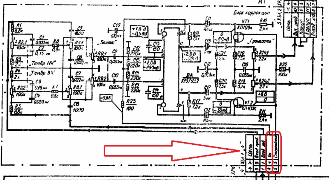 Темброблок я вытащил из Магнитофона Весна 212с. Взяв схему я начал смотреть, что и куда паять.