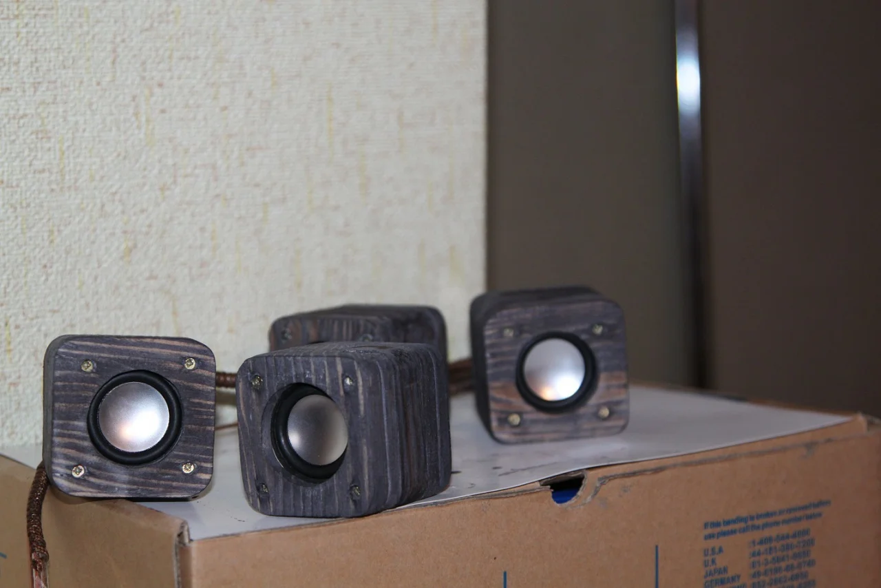 Под динамики приклеиваем прокладки. Те самые ножки, которые использовали на нижней части усилителя. Делаем это для держания самих динамиков. Динамики прижимаются хорошо, на испытаниях не дребезжали)