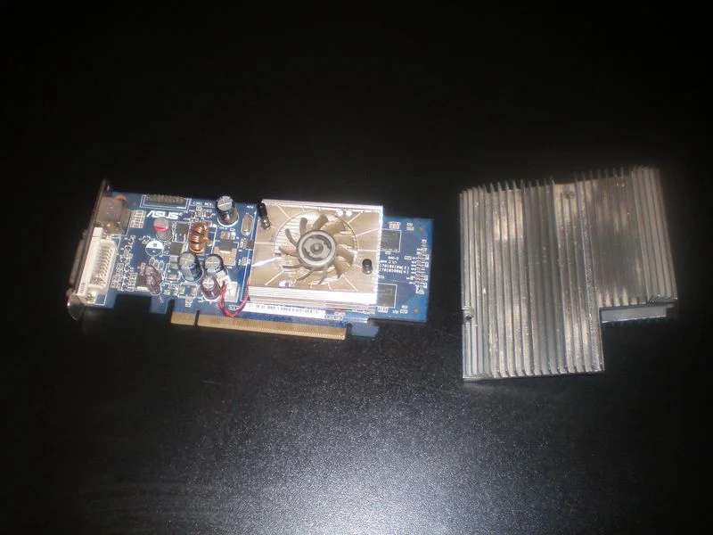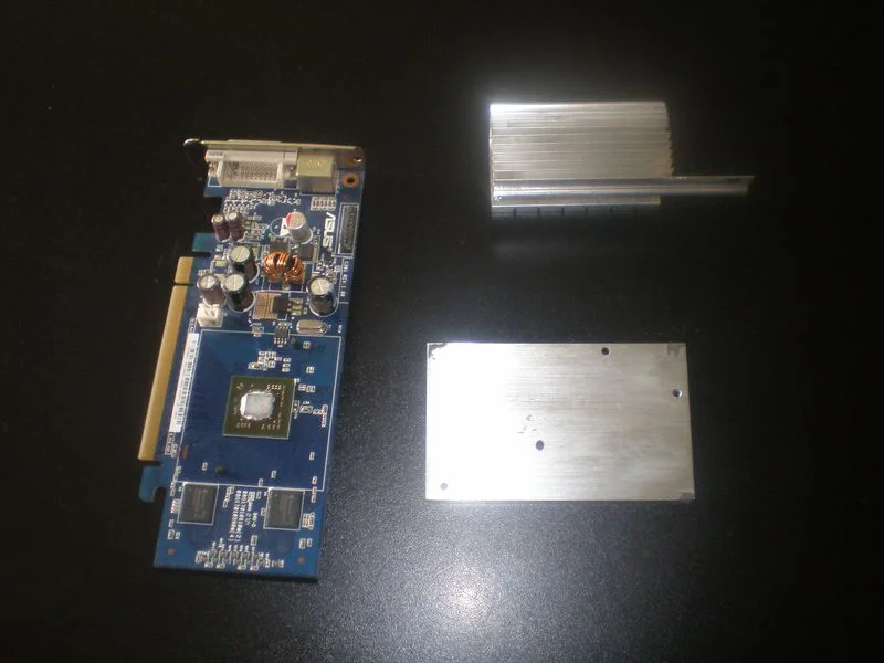 Тут я вдруг вспомнил, что не поменял радиатор на видеокарте. Порылся в хламе, нашел донора, распилякал под нужный размер, просверлил отверстия под крепеж.
