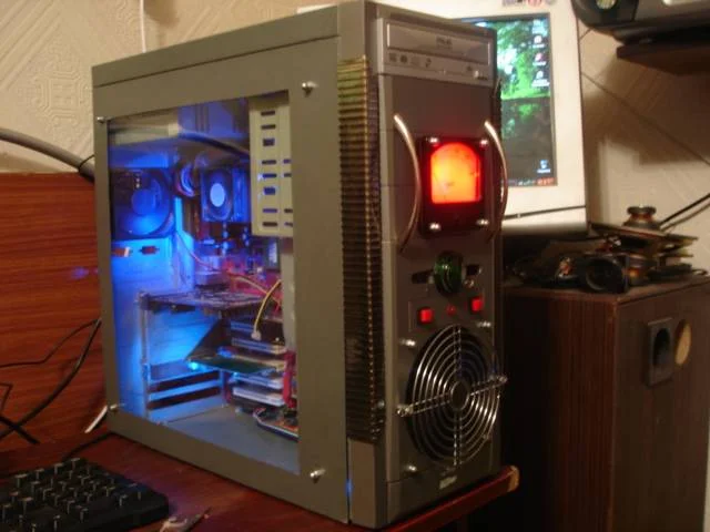 Первым делом я естественно вырезал боковую панель и вставил стекло. Потом в передней панели вырезал отверстие под кулер 120 мм. Установил декоративную сетку, поставил две кнопки, пуска и перезагрузки. Затем поставил индикатор загрузки HDD из старого амперметра, заранее заменив там шкалу и поставив подсветку. Две ручки от тумбочки и колпачок от индикаторной лампочки поставлены просто для красоты. На этом этапе том модинг был закончен. Компьютер не перегревался, смотрелся оригинально, и я больше не обращал на него внимания, к тому же было много других идей.