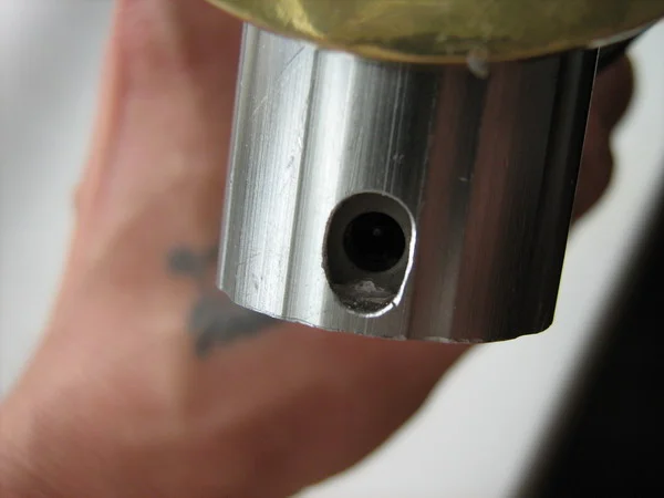 Продолжение.Сначала хотел сделать нижнюю часть из конденсатора (даже отпилил) оказалось очень тонкие стенки .Пришлось делать из сантехнической втулки, но у неё оказался малый диаметр.Собираем вот такую штуковину(она нужна чтобы зажать в дрель).Начинаем на малых оборотах точить.После этого сверлим отверстия и растачиваем чтобы влез корпус металлического фонарика.