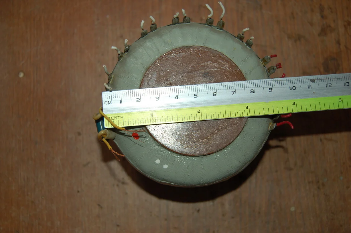 Попался в руки мне еще один ТОР , стоял видимо когда то в катушечнике Олимп. Мощность в районе 100Вт. Имеет в наличии кучу обмоток, 2х2,5 , 2х1,3 , 5 , 4 , 2 х18, 33 , 83В. Что мне в этих трансформаторах нравится, так это полнейшая тишина при включении в сеть, даже если ухо приложить к нему, ощущение что он не включен . ТОР залит на подобии эпоксидной смолы, разобрать его для перемотки , не повредив вторички нереально. Моя коллекция пополняется))