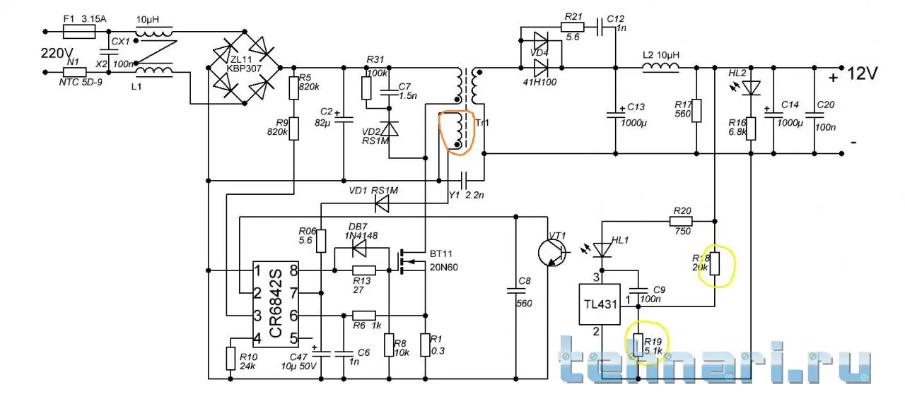 Схема похожая на эту , пришлось резисторы подбирать и обмотку питания ШИМ доматывать , при пониженном напряжении ШИМ отказывался работать .