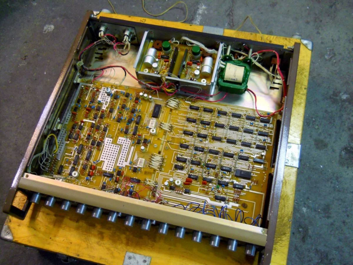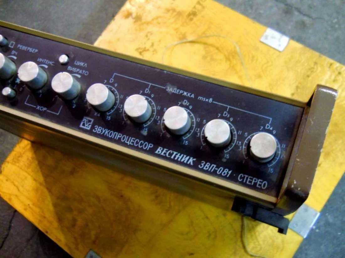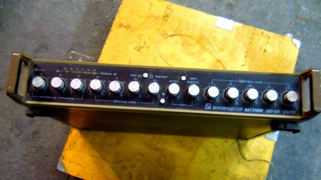 Нашёл вот такой агрегат с гордым наименованием "Звуковой процессор", производства аж 1992 года. Размеры его 480 Х 470 миллиметров, боковины сделаны из толстого алюминия. Внутри куча логических микросхем. Подозреваю, что всю эту конструкцию можно сделать на основе одного микроконтроллера. :)
