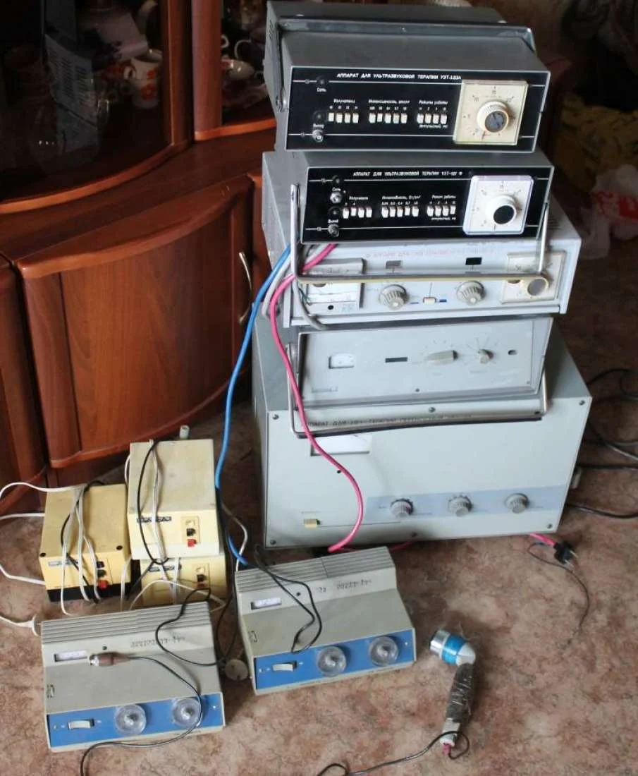 разобрать успел два прибора результат два трансформатора неизвестной наружности и куча деталей пока не вытаскивал ничего просто осматриваю фото внутрянок выложу позже, на работе куда более интересные приборы остались размером с с советский маяк, это техника из физиокабинета даты выпуска от 70 годов до 94, глядишь что ценное попадется и раритетное :tehnari_ru_942: