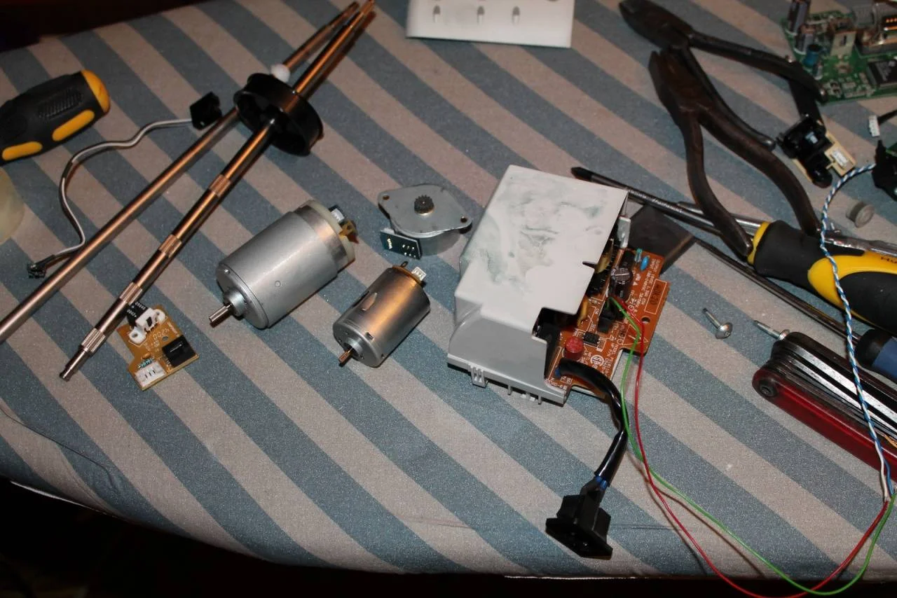 Нашел и разобрал на: БП 18В 1,4А; 2 моторчика(не шаговых) 18В, 1 шаговый, маленький; куча плат с элементами.
