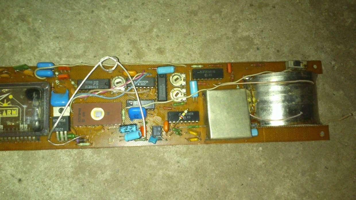 Это, современным языком говоря, радар-детектор. Начало 90-х, кооперативное (полукустарное) производство. В изогнутой жестянке с боку платы (это рефлектор) находится собственно датчик - свч диод. Умел этот девайс определять только сам факт облучения гаишным радаром. Ну и длину волны определить (в ПЗУ примитивная математика зашита).