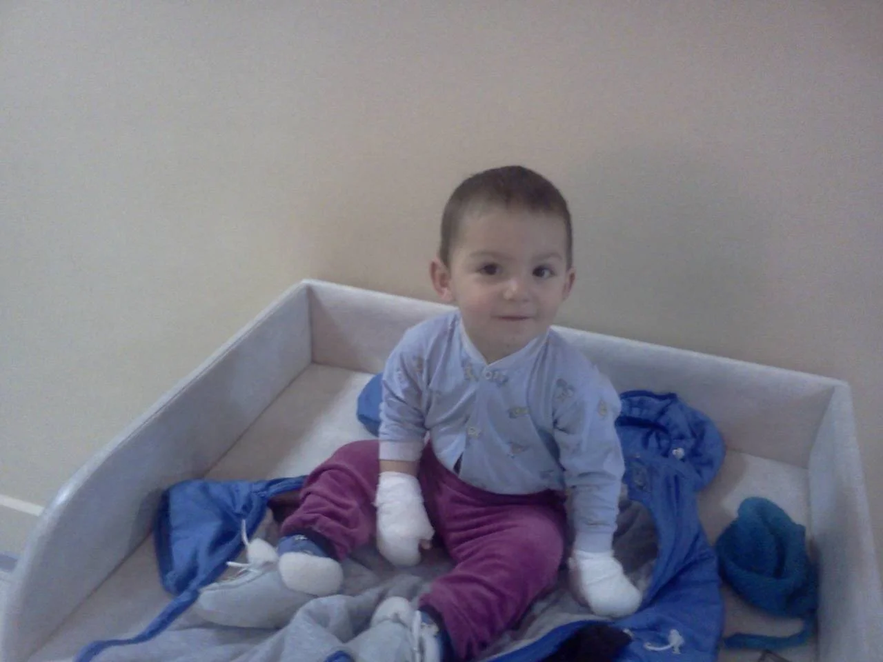 Теща села пить чай и посадила малого рядом, при том что я категорически против, чтобы сын сидел за столом со всеми, для этого у него есть свой столик. В общем малой дотянулся до кружки с горячим чаем и опрокинул ее на себя. На фото не видно, еще и нога обожжена.