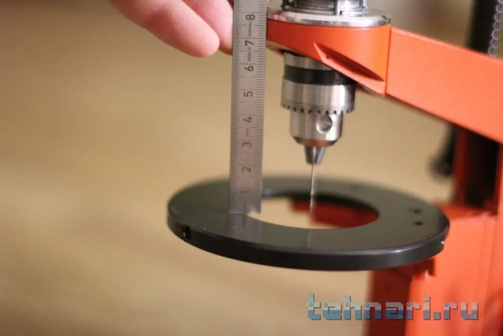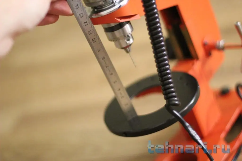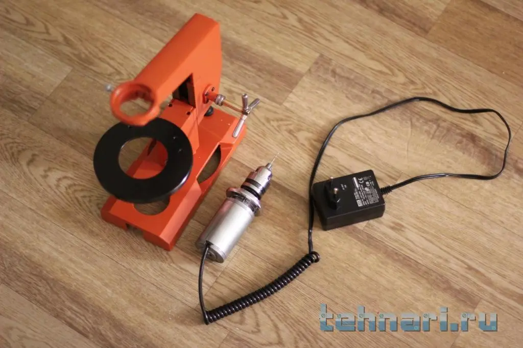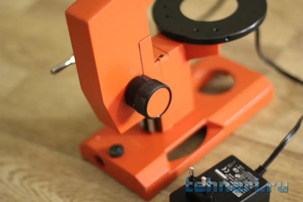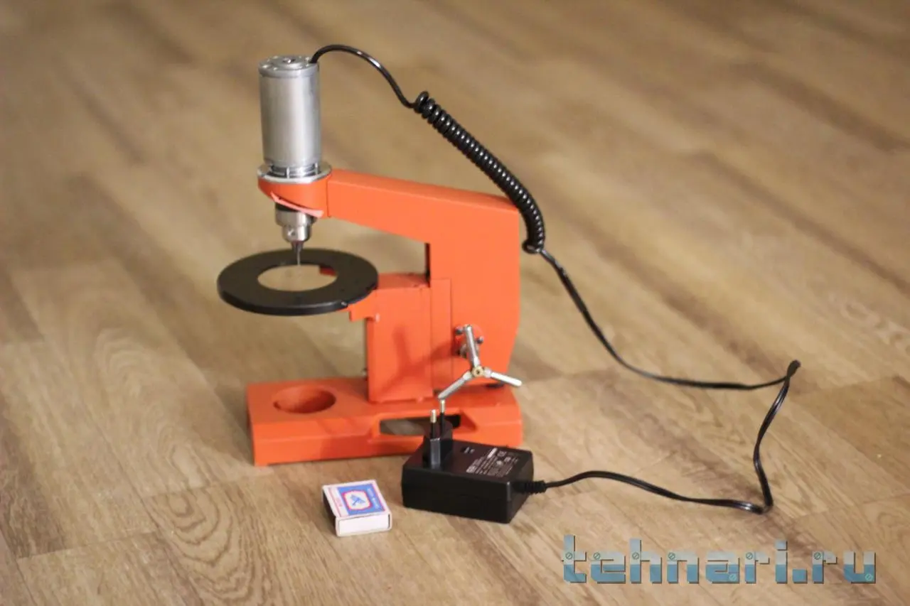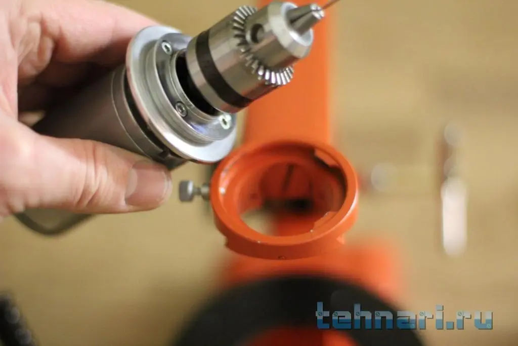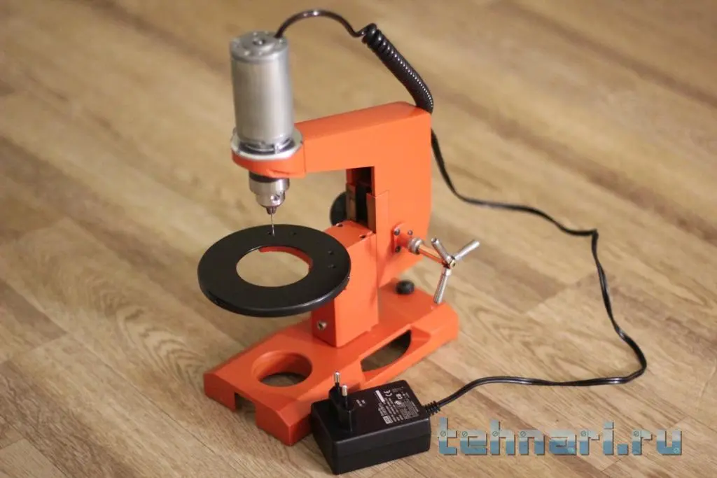 Микроскоп был точно такой же, что и первый. Достался трупом, без оптики и стола. Двигатель тоже б/у. Вообще тут все кроме блока питания и патрона из помойки можно сказать. Станина была разобрана до болтика, отмыта, почищена и окрашена в "станочный" морковный цвет, все лишнее с нее снял, оставил только нужное для сверления. Двигатель тоже был разобран для ревизии, внутри все оказалось в приличном состоянии, подшипники без люфтов и шумов, ротор целый, щетки тоже еще походят.Патрон из Китая опять. Для удобства переделал ручку с одной стороны. Крепление в этот раз съемное, после небольшой доработки мотор встал почти идеально на "родной" стальной байонет от микроскопа. Это позволило снимать его за считанные секунды и использовать отдельно. Для удобства переделал ручку с одной стороны.