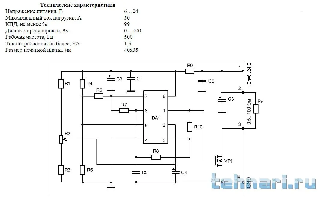 По совету уважаемых технарей попытался сделать ШИМ-регулятор (схему прилагаю). Купил этот шим готовым набором (рассыпуха+готовая плата для монтажа). Собрал. Работает но не так как ожидалось. Обороты регулирует, но от "середины" переменника, т.е. мотор не крутит, при вращении ручки резистора на 50 процентов начинает сильно пищать, потом раскручивается с поворотом ручки дальше,но до 100% оборотов не доходит, по субъективным ощущениям до 80%. При этом транзистор не греется, а сам мотор теплый становится быстро, при этом напрямую от источника он не греется вообще. И на малых оборотах легко остановить можно,хотя ожидал другого...