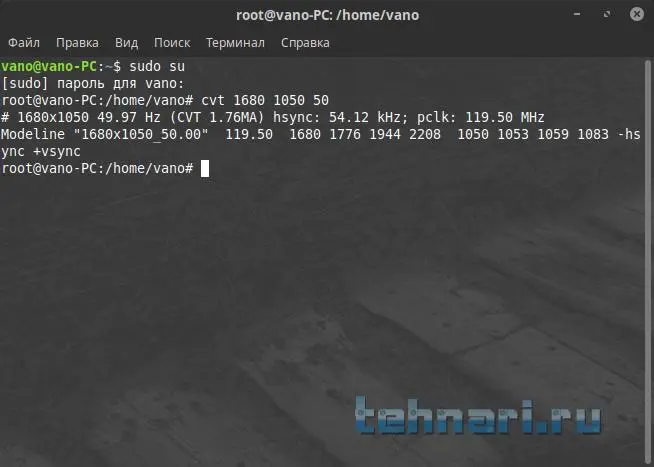 Далее вводим команду cvt 1680 1050 50, где 1680 и 1050 разрешение, а 50 частота обновления. Опытным путем выяснил, что хоть моник и поддерживает 120Гц, в данной конфигурации(может из-за HDMI или кабеля) выше 50 Гц не работает.