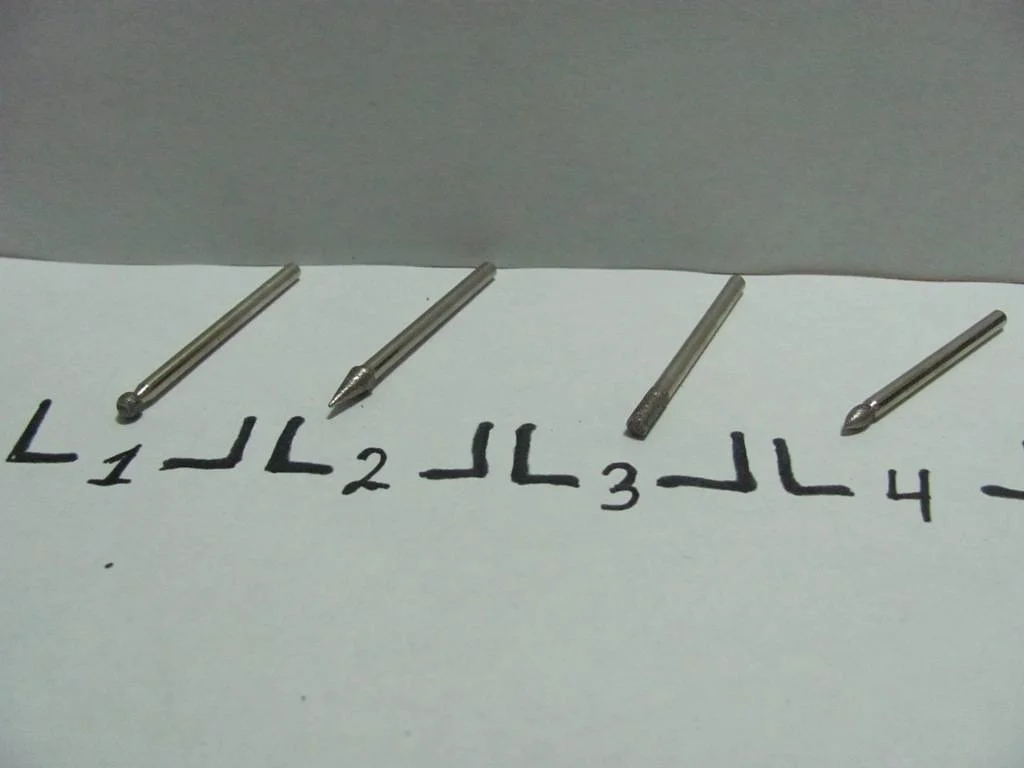 На втором алмазные боры для обработки стекла и камня. Используются на высоких оборотах и с обязательным охлаждением водой. Не обрабатывать сталь, они от этого испортятся.