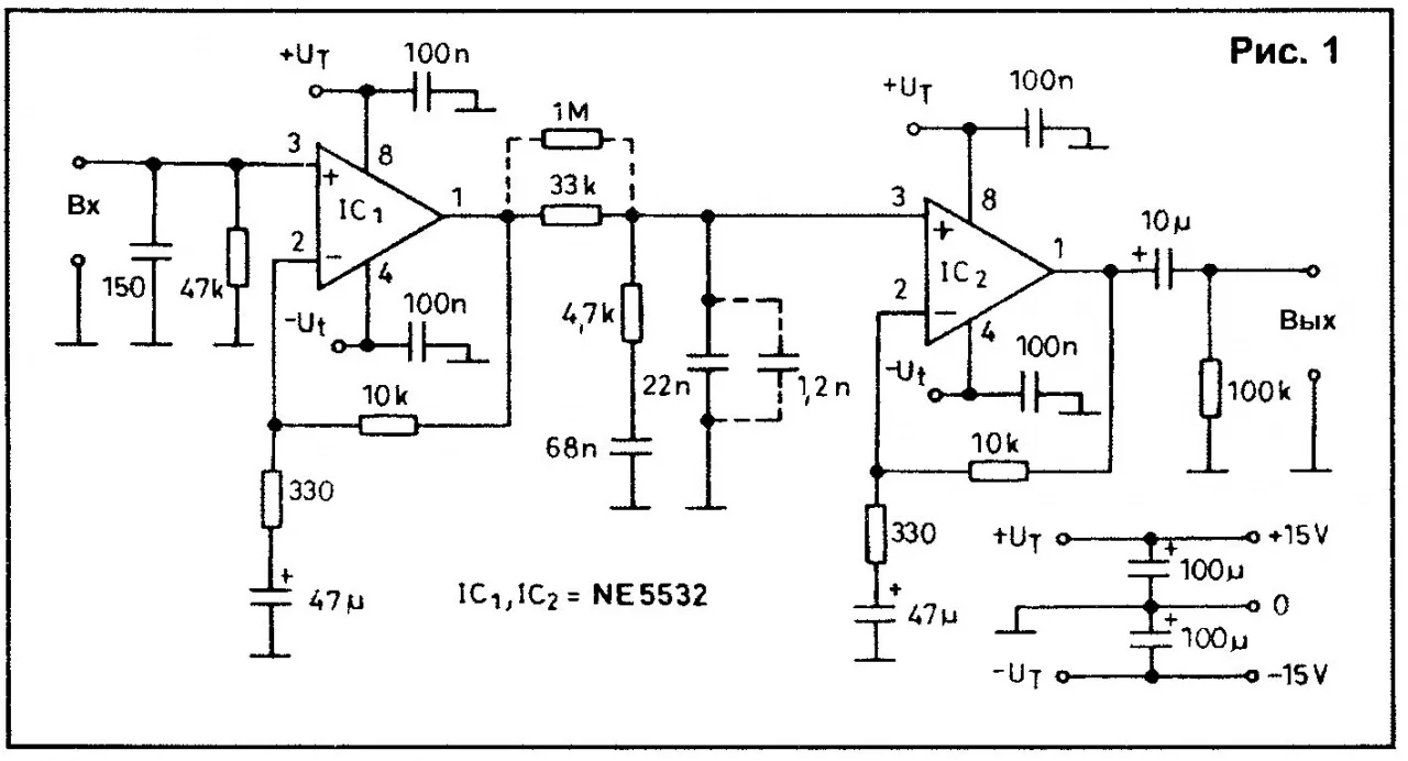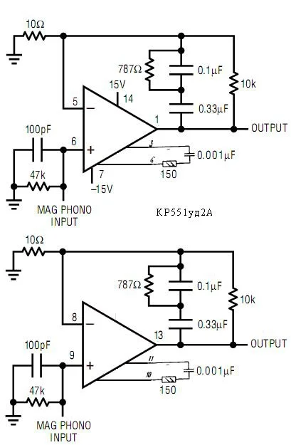 Так как МС аналог 551УД2 то еще пару схем для винила: И номиналы для 3-й схемы. R1-47K//R2-680//R3-2.2K//R4-110K//R5-750K//R6-47K//R7-33K. C1-1.0 n//C2-3.0 n//C3-2.2m// Схема оч хорошо звучит.И работает совместно с рокотфильтром.