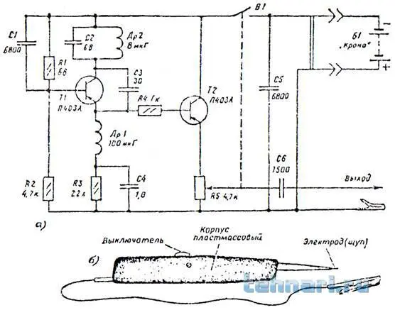 Недавно в закромах нашёл этот приборчик. Названия на корпусе нет, только цена (9 рублей). Прибор по определению советского производства. Схема собрана на трёх транзисторах, серии МП. Помогите, кто помнит и работал с ним, что это!!! И название прибора, что бы я мог найти описание.