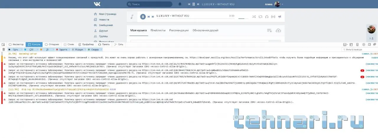 Вот тут ниже скриншот, из панели разработчика в Файрфокс, что происходит при попытке прослушать музыку.