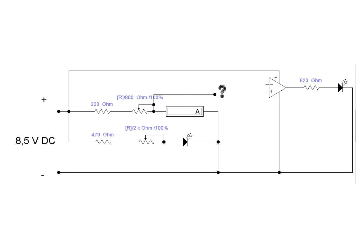 Добрый день! Делаю себе ночник из указателя давления масла от ГАЗ-3307 (схема прилагается, сам прибор условно считаю амперметром). Питание - 8,5 вольт с зарядного устройства от телефона, с помощью переменного резистора (200-1000 Ом) можно задавать положение стрелки относительно шкалы, светодиод ночной подсветки соединен через ключ.