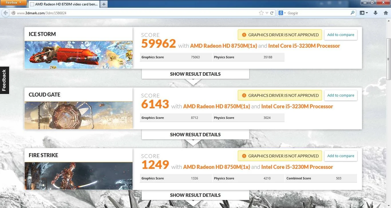 у меня сейчас 3дмарк13 тоже себя ведет как-то странно. при выключенном оптимусе(ваш аналог эндуро) он показывает куда больше. можете попробовать в биос выключить эндуро. лично я забил, т.к. игры работают отлично.