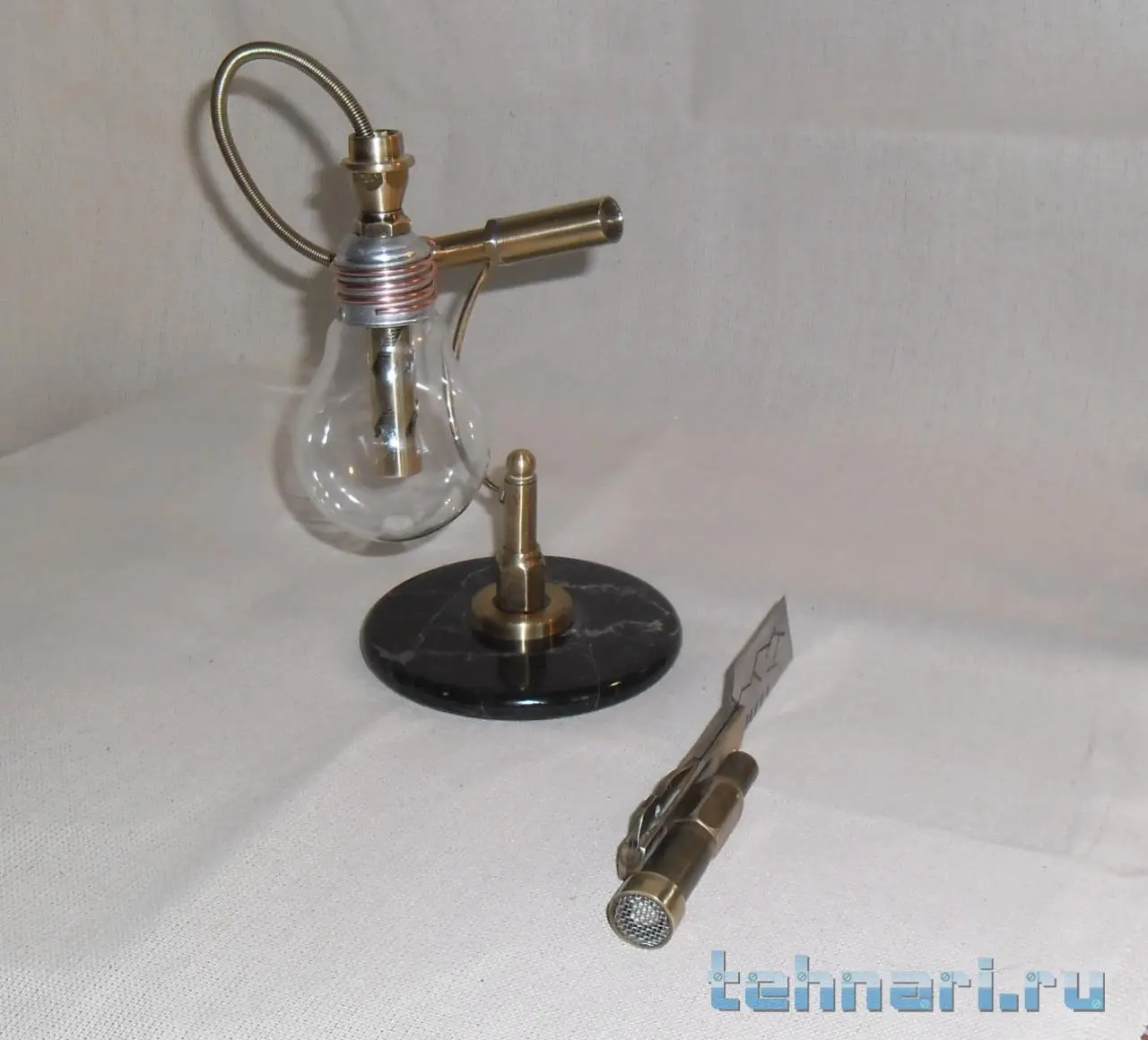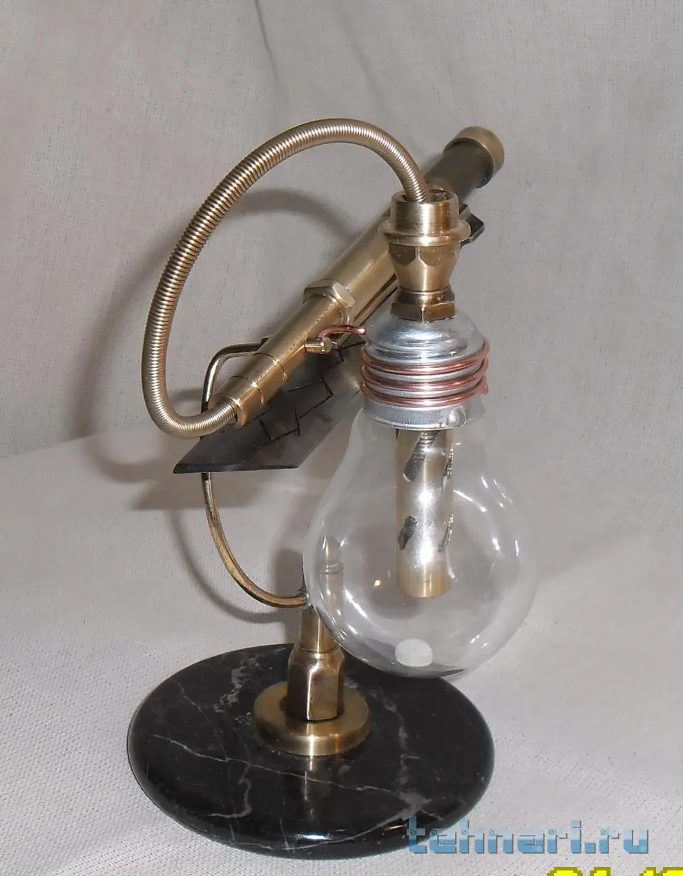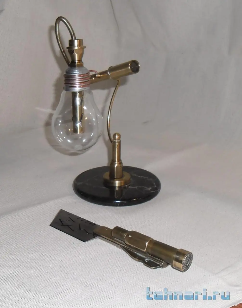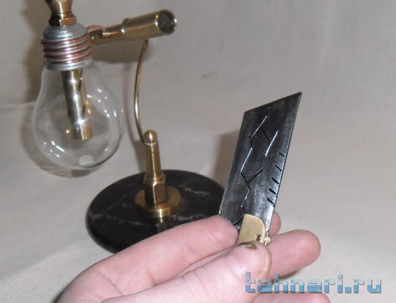. Так что делаю, если попадается подходящий металл. Этот ножик сделан совершенно случайно. Был остаток от лезвия ножа, выкидывать у меня привычки нет , поэтому и этот небольшой кусочек пригодился. И так, собрана вся композиция из латуни, старой лампочки и мраморного круга, оставшимся от одной из поделок.