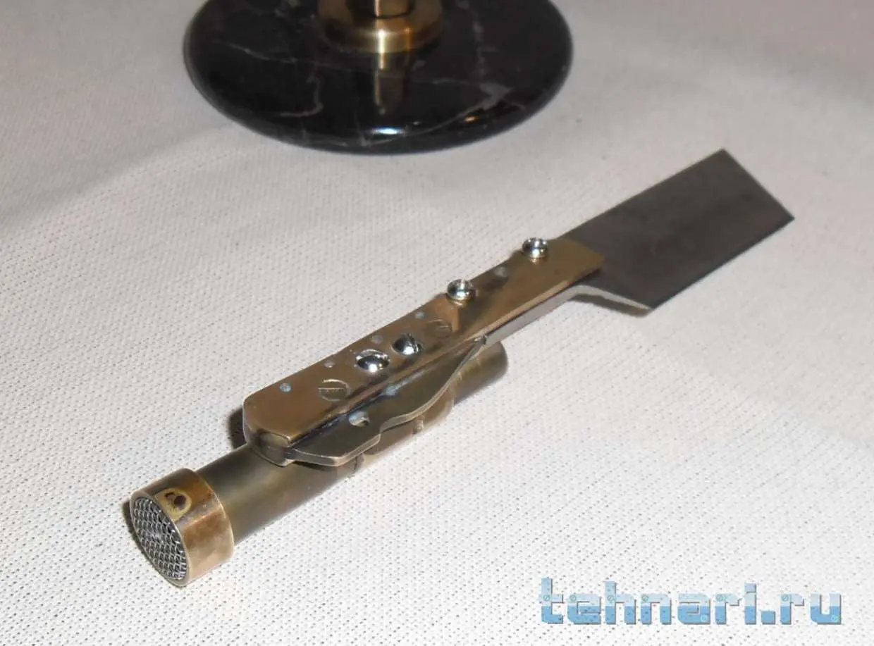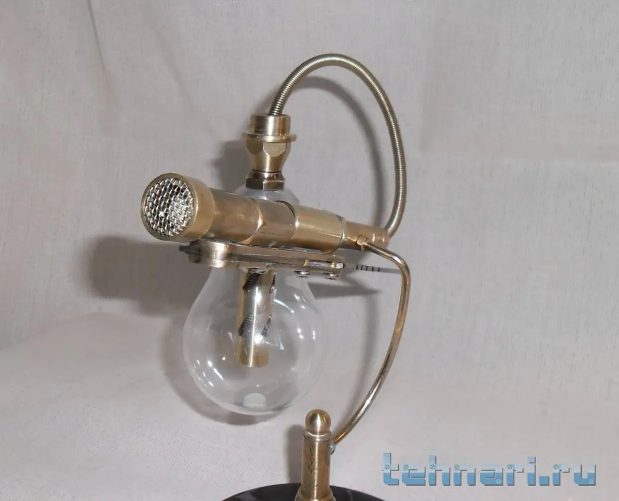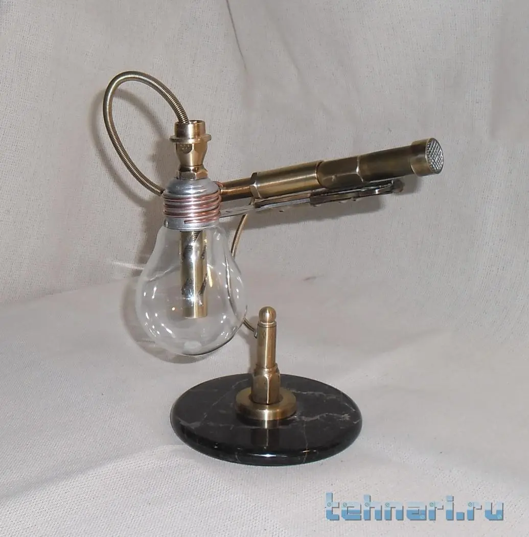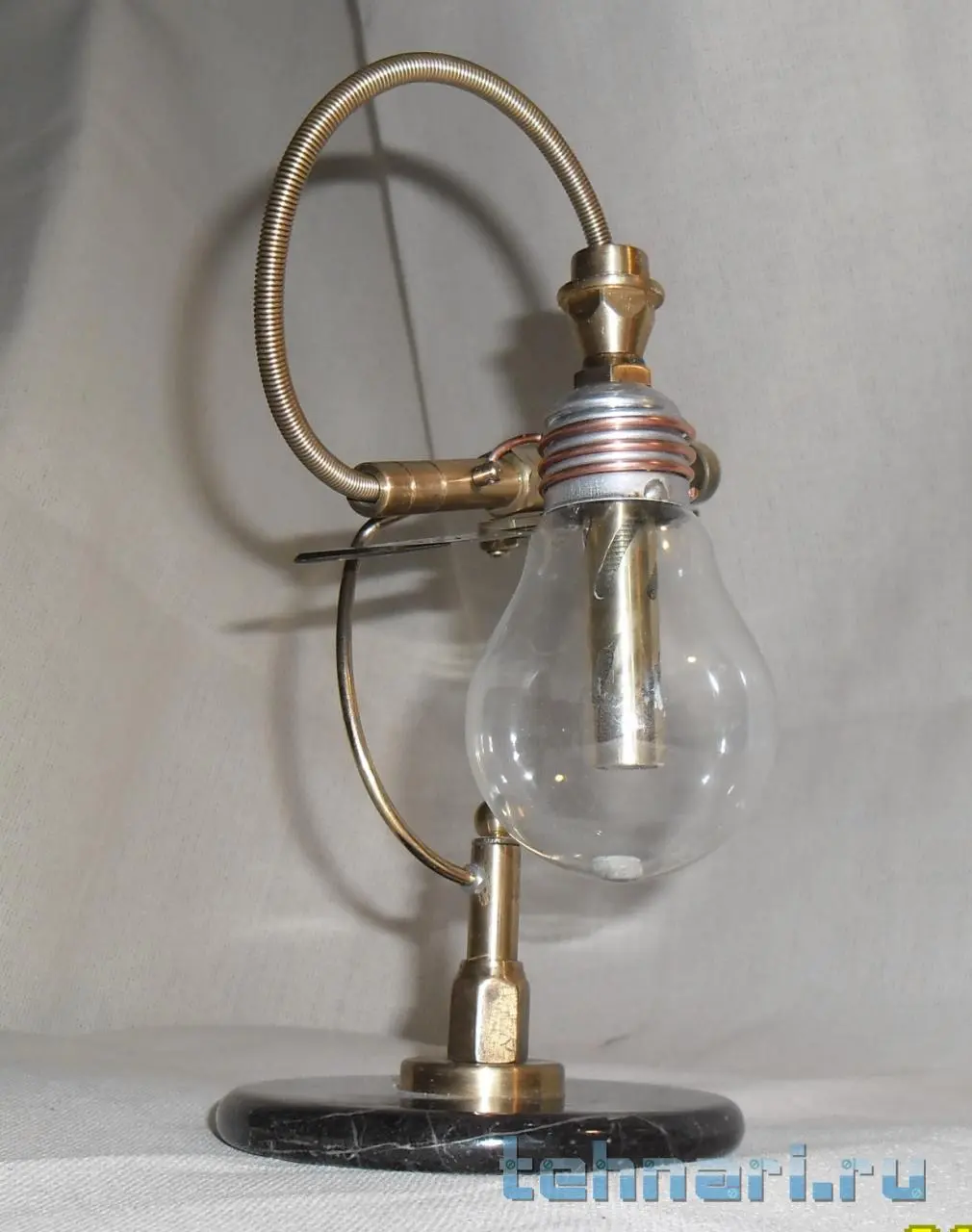 . Так что делаю, если попадается подходящий металл. Этот ножик сделан совершенно случайно. Был остаток от лезвия ножа, выкидывать у меня привычки нет , поэтому и этот небольшой кусочек пригодился. И так, собрана вся композиция из латуни, старой лампочки и мраморного круга, оставшимся от одной из поделок.