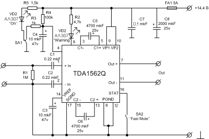 16 нога МС предназначена для включения в класс Н. Кстати он в приведенной схеме выключен, так как подключен на общий провод. Точно подключил к "+" питания?Если да, то попробуй 10 кОм уменьшить до 1 кОм и посмотри, что получится. Если нет других косяков, то должно работать.но усь при увеличении громкости усь отключается тока на минимуме работает . в чем может быть проблема .