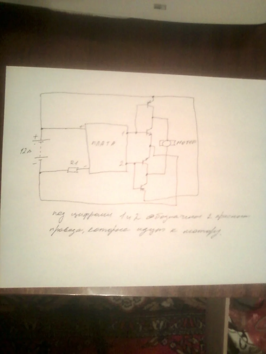 на сколько я смог разобраться в вашей плате, то у вас моторчик урпавляется двухтактным ключом для возможности реверса (видите 4 транзистора возле двух красных проводов, которые идут к мотору?) сейчас накидаю схемку, что вам нужно будет сделать.