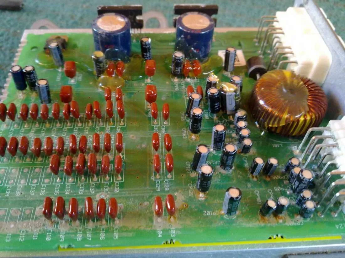 Это фотки уже очищенного от коррозии УМ. Верхняя часть (по 2-му снимку) пострадала меньше всего, 2 шт. TDA8563Q и тот транзистор даже не менял, он под силиконом. А вот в процессорной части пришлось поменять почти все микрухи кроме 4-х: SA572 и NE5517 по 2 шт. (в наших магазинах таких нет и на заказ не привезли).