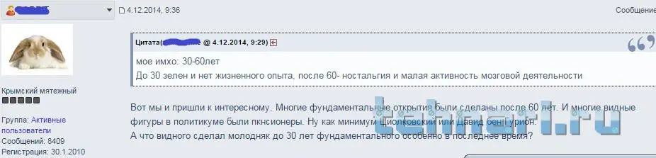 Фёдору Углову или Жоресу Алфёрову об этом расскажиИзвините,больше не буду...Вообще все от человека и воспитания-образования зависит.Есть в 25 кандидаты наук,а есть и 60-ноль на палочке...Но все равно,в том,что с возрастом не прогресс,а регресс идёт вы меня не переубедите