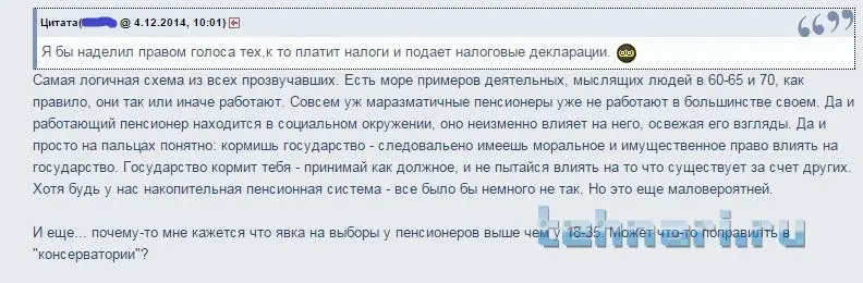 Точно.Странная логика: забрать голоса у пенсионеров и отдать детям (их родителям). Получается, что родители в очень многих семьях, имеющих несколько детей, будут принимать решение за них?