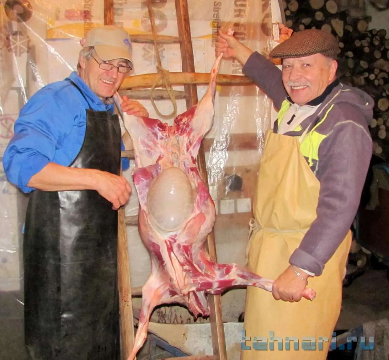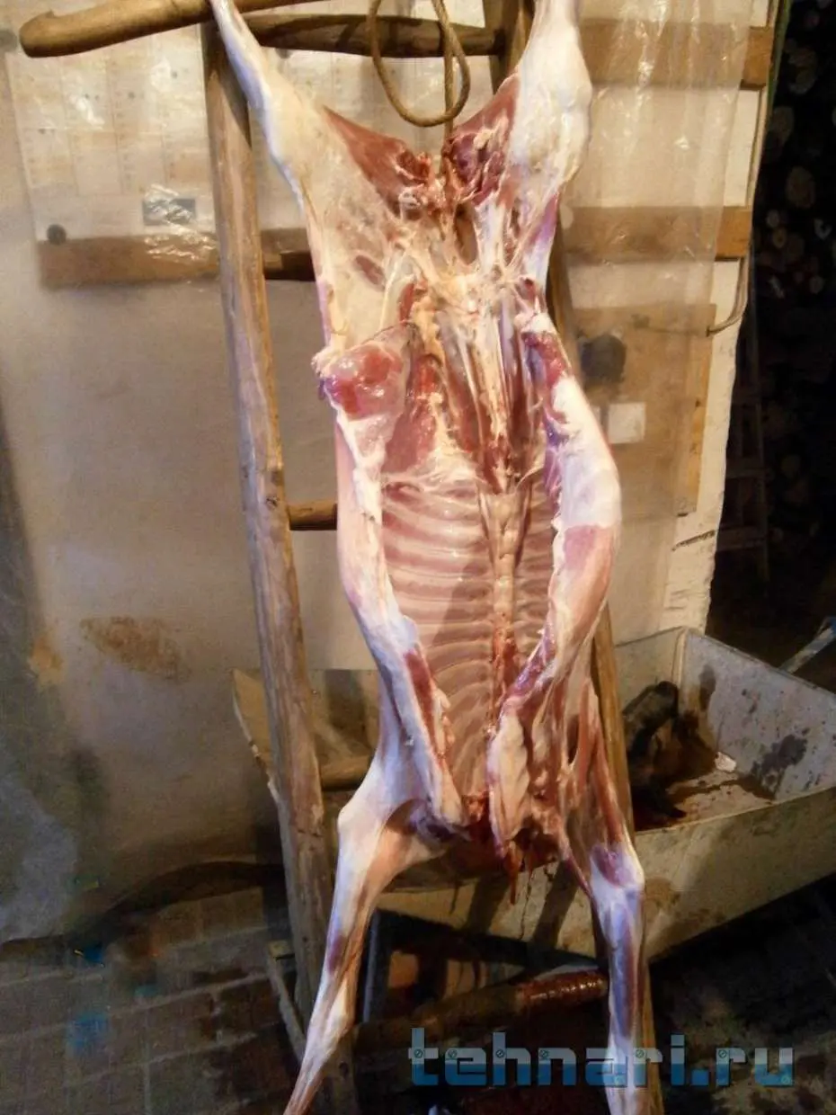 На днях с приятелем купили и зарезали. Молоденький, чистый выход, не считая ливера и сетки, 9 кг. :)