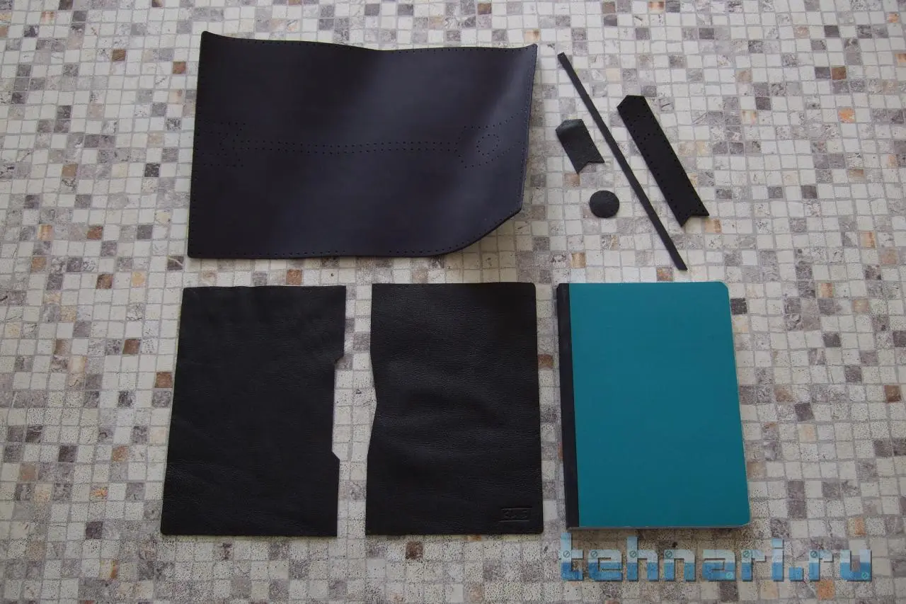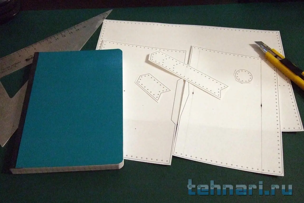 В моем нынешнем блокноте осталось 3 пустых листа. Пора обзаводиться новым. Естественно, я планировал сшить под него обложку из кожи. Сам блокнот купил в канцелярском магазине. Нарисовал и нарезал выкройку: