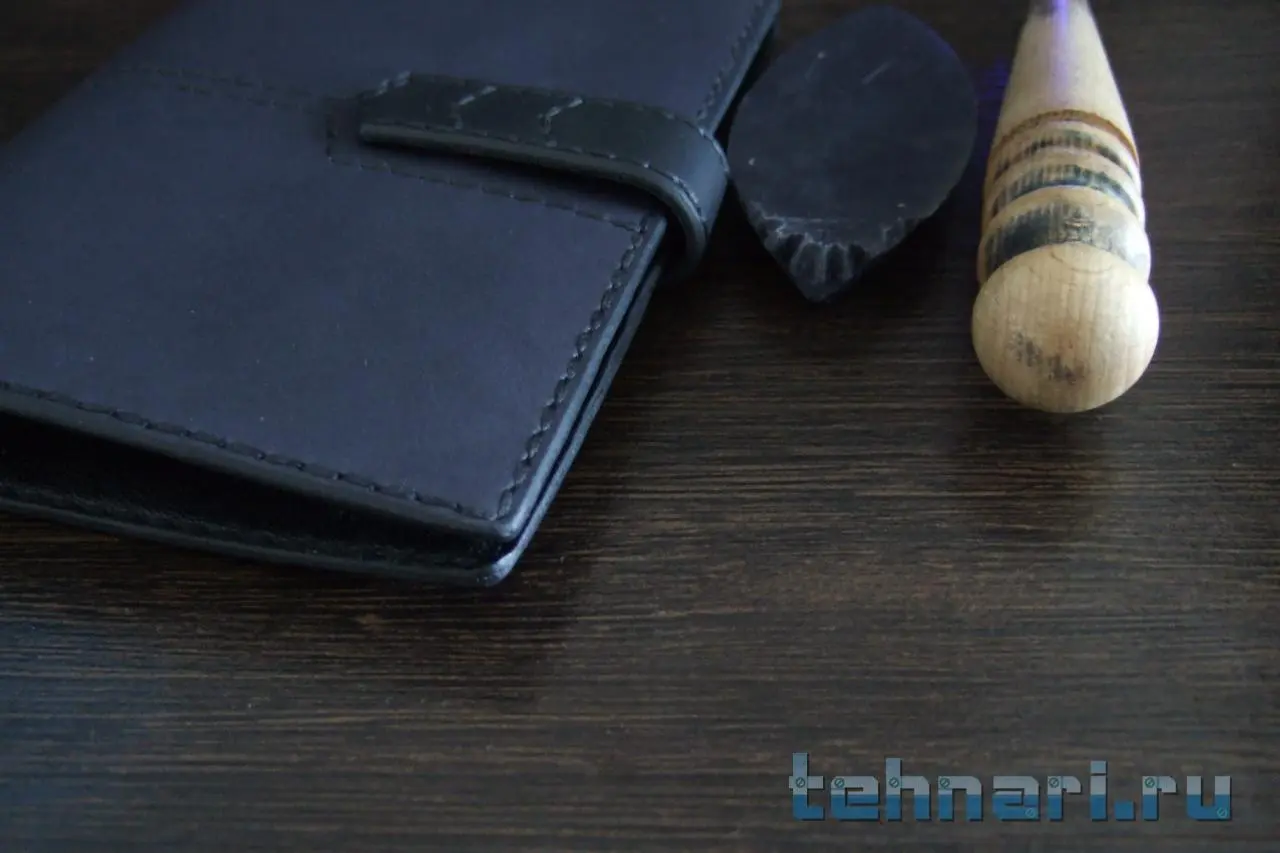 Застежку блокнота захотел магнитную. Магниты у меня давно откуда-то взялись. Маленькие. И чтобы они лучше схватывали через кожу, истончил ее: