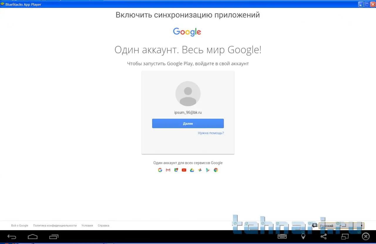Что ж, смотрим дальше, решил я найти интересующую меня прогу, нажав на специальную кнопку поиска, и вбив запрос в поле, мне предложили искать на маркете, после нажатия на кнопку "найти на маркете" нас просят сделать одноразовую настройку. Нажимаем продолжить, нас просят ввести свои данные, которые мы указали при регистрации в маркете. Далее нас просят настроить аккаунт Blue Stacks, для чего не понятно, просто отмечаем свою учётку и жмем ок. Далее нас просят включить синхронизацию приложений, и перебрасывают на главную страницу гугл, где мы должны произвести вход, после долгого и мучительного ввода пароля видим долгожданное сообщение "выполняется вход", после чего нам говорят что все сделано, нажимаем поехали и видим наш маркет!