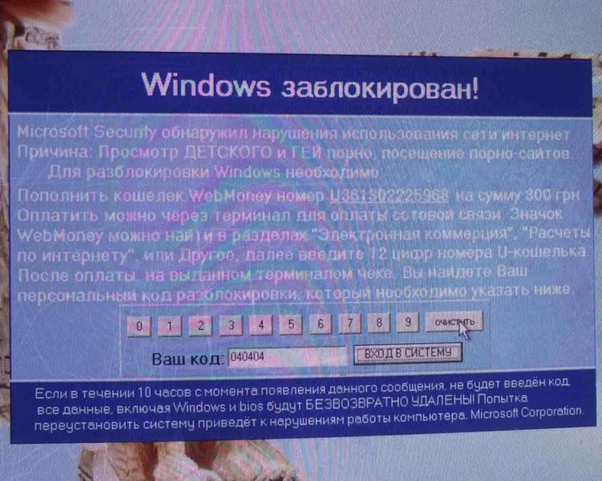 при загрузке ХР выдает банер (см фото) и просит денег на веб-кошелек. Ничего сделать нельзя, только включить экранную клавиатуру, но от нее толку нет.